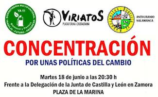 [Img #27837]Una decena de plataformas: Viriatos, Terra SOStenible, NO EN MI TIERRA: Anti Minería de Zamora, Pro Biorrefinerías de La Robla (León) y Barcial del Barco (Zamora), Por la Sanidad Pública, ANTI URANIO de Salamanca, Contra Macro Granjas, Porto de Sanabria, Pueblos Vivos, Ciudadanos de León,  ya han confirmado sus asistencia al acto de protesta que tendrá lugar el próximo martes día 18 de junio frente a la Delegación de la Junta de Castilla y León en Zamora (plaza de la Marina).