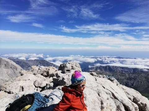 "Ya quedaba poco y era más fácil, pero mi padre me llevaba asegurada con la cuerda por si me resbalaba. Y había que tener mucho cuidado para no tirar ninguna piedra a los que venían detrás. Cuando se veía la virgen de la cima, me puse delante para llegar la primera. Qué alegría, por fin lo habíamos conseguido, cuando serían las 11:00 h. de la mañana. Estábamos los más altos, se veían todos los picos, las nubes por debajo y hasta el mar. Después de descansar y comer un poco, empezamos a bajar, primero destrepando, atada como en la subida y, después, rapelando igual que habíamos practicado en Las Enillas, pero mucho más alto".