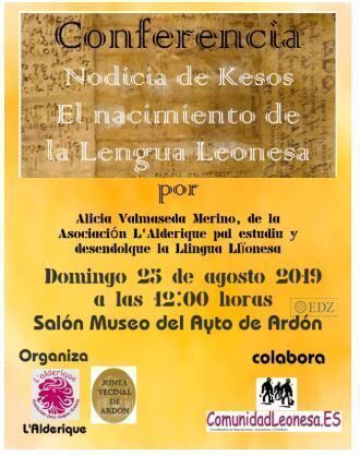 El próximo domingo, 25 de agosto, a las 12:00 horas, en el salón-museo del Ayuntamiento de Ardón y organizado por la Junta Vecinal de Ardón y la Asociación L'Alderique pal estudiu y desendolque la Llingua Llïonesa, Alicia Valmaseda Merino, coordinadora y portavoz de ComunidadLeonesa.es impartirá la conferencia: "Nodicia de Kesos: El nacimiento de la Lengua Leonesa".