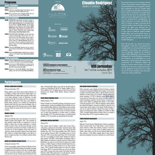 II.-Las VIII Jornadas Claudio Rodríguez. Tiempo y leyenda (7 - 9 de noviembre), se inauguran en la Biblioteca Pública el día 7 a las 18:00 h. Intervendrán ponentes, pensadores y creadores que configuran el programa: Josep Maria Esquirol, David Pujante, Natalia Carbajosa y Miguel Casado estarán presentes junto a las poetas Esperanza Ortega y María do Cebreiro.