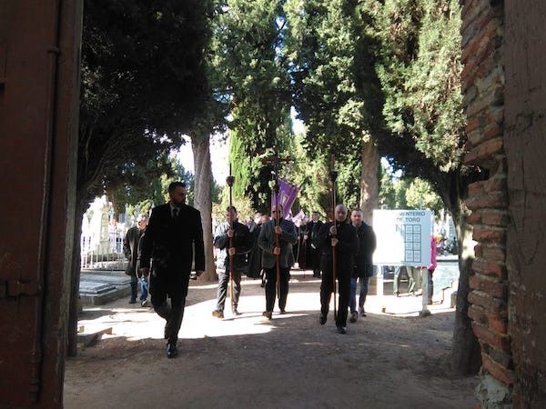 La Cofradía de Jesús Nazareno y Ánimas de la Campanilla de Toro celebró el pasado domingo, 3 de noviembre, su tradicional Fiesta del Cementerio o de Difuntos. Según establece el ritual organizado por la Cofradía, la comitiva se reunió a las 10.00 horas en la sede de la hermandad, la iglesia de Santa María de Roncesvalles y Santa Catalina, y desde allí comenzó su procesión hasta el cementerio de la localidad, donde se ofició una misa por los difuntos de la hermandad.