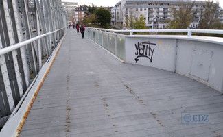 Tampoco es que los peatones lo tengan fácil atravesando la pasarela, las juntas en ambos lados necesitan una renovación completa, para que vuelvan a cumplir esa misión de tapar la abertura obligada para la dilatación y movimientos. El remiendo para salvar la situación hecho en la parte de Pinilla con el añadido de una chapa no deja de ser una chapuza. Y pasar, sigue siendo posible, a pesar de que las fijaciones de las tablas ya van asomando la cabeza por encima de estas, al no ser los anclajes adecuados con resistencia a los movimientos de la madera sin desclavarse.