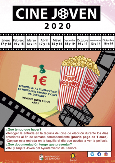 El resto de los requisitos se mantiene, de manera tal que podrán beneficiarse de la campaña de Cine Joven los jóvenes que dispongan de la Tarjeta Joven del Ayuntamiento (no otros carnets), y que tengan entre 12 y 25 años. Las sesiones ofrecidas habitualmente serán las los viernes y sábados de la tercera semana de cada mes, a las 17:30 y 20:15 horas y en ambos cines, Valderaduey y Multicines Zamora. Por lo tanto las primeras sesiones de este año serán el próximo viernes y sábado.