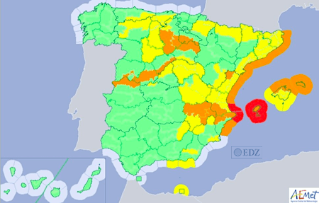 El gradiente de presión será muy intenso en la fachada mediterránea y Baleares, con vientos del norte y nordeste fuertes o muy fuertes y rachas que localmente podrían superar los 100/120 km/h. El estado de la mar será muy adverso, con intervalos de viento de fuerza 10 y olas que podrían alcanzar los 7 metros en las zonas costeras del extremo oriental peninsular e Ibiza.