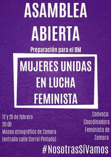 La Coordinadora Feminista de Zamora convoca a todas las mujeres zamoranas a participar en las asambleas abiertas convocadas, a la vez que anima a las mujeres a participar, aportando ideas o colaborando en las diferentes actividades que este año se realizarán en torno al lema: "Mujeres Unidas en la Lucha Feminista".