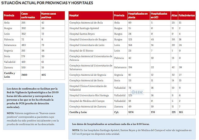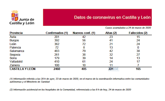La Consejería de Sanidad ha confirmado a las autoridades sanitarias nacionales, desde la última comunicación pública, 405 casos más de infección por SARS-CoV-2, con lo que en Castilla y León se registran 2.460 positivos. Asimismo el número total de altas hospitalarias acumuladas hasta el momento es de 221,81 más que ayer, y los fallecimientos alcanzan la cifra de 165, sumando 41 más que en la última comunicación. Con síntomas y aislados en sus domicilios la cifra sube hasta los 12.908 en Castilla y León.