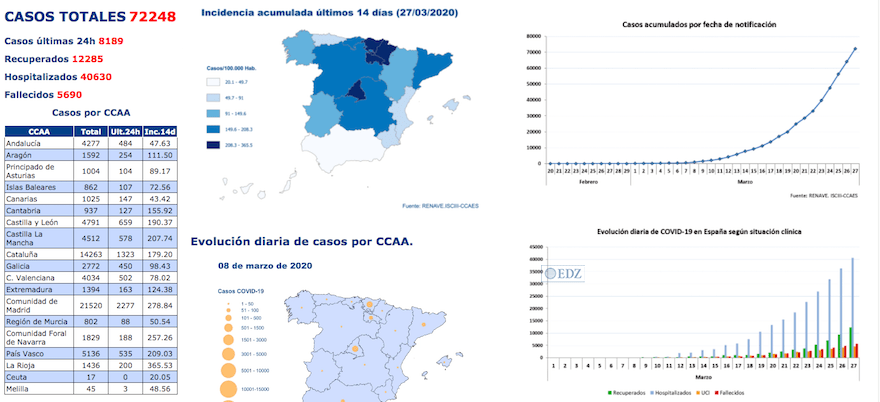 Aunque la peor noticia de los datos de hoy está en la cifra de fallecidos, la más alta registrada en España durante esta crisis sanitaria: 832 muertos en 24 horas (769 ayer), los 72.248 infectados, con 8.189 más que las cifras conocidas ayer, supone una bajada del porcentaje de contagios, ya que hemos pasado a un 12,7 %, mientras que ayer fue del 14 % y anteayer de un 18 %.
