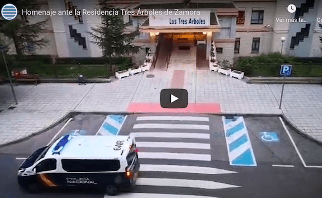 Vídeo con el homenaje de las 20 h., esta vez con miembros de la Policía Nacional, Local y servicios de emergencia, con aplausos y sirenas para agradecer y animar a los trabajadores de la residencia de mayores pública de la capital zamorana.