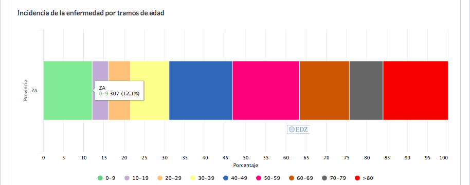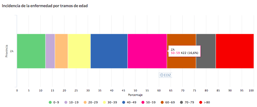 En Zamora, en Medora se han recogido, entre casos leves sin confirmar, más graves e ingresados, la mayor incidencia de la enfermedad se ha dado en personas de 50 a 59 años (422 registradas), un 16,6 % y en el rango de edad de más de 80, con 406 personas (16 %).