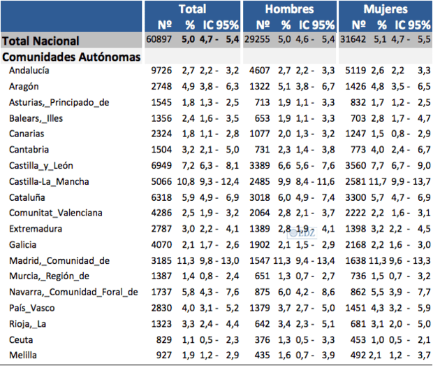 Por comunidades autónomas, existe una marcada variabilidad geográfica. Así, Ceuta, Murcia, Melilla, Asturias y Canarias presentan prevalencias inferiores al 2 %, mientras las Comunidades de Castilla-La Mancha y Madrid superan el 10 %, Castilla y León tiene un 7,2 %. En los mapas provinciales, destaca la agrupación central de provincias con prevalencias iguales o próximas al 10 % en el entorno de Madrid.