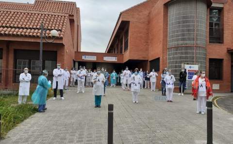 En las puertas de los centros de salud y hospitalarios se han reunido trabajadores y sanitarios, con un silencio de luto, en recuerdo, con un mensaje de ánimo y consuelo a las familias y seres queridos de los fallecidos.