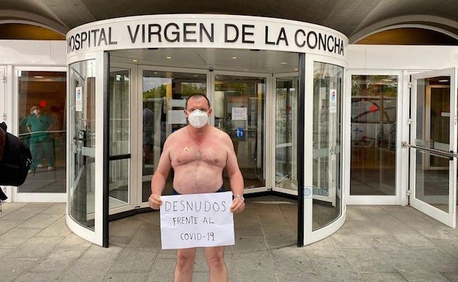 Sus motivos, quedaban claros en el cartel espontáneo que portaba: "desnudos frente al COVID-19", un lema que comparten sus compañeros sanitarios, más tras haberse retirado durante estas últimas semanas varios materiales de protección en mal estado: guantes, varios tipos de mascarillas...