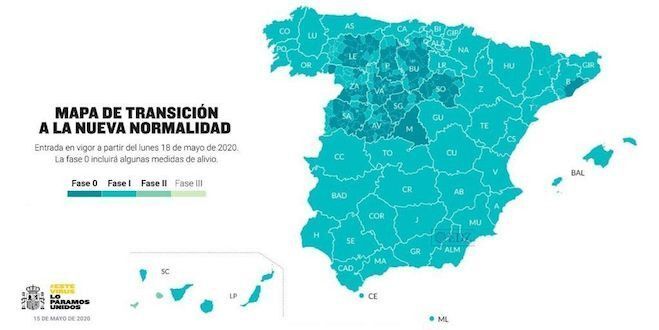 La Comunidad Valenciana, Andalucía y Castilla-La Mancha pasan por completo a la Fase 1, así, un 30 % de la población española sigue en fase 0 (14 millones de ciudadanos), un 70 % de la población (32 millones de personas), estará en fase 1 y 45.000 ciudadanos progresan a fase 2 el lunes.