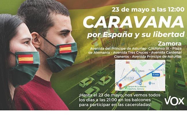Según informan desde Vox Zamora, convocan a su manifestación, que partirá a las 12:00 h. "en la zona de aparcamientos próximos a las pistas de examen de tráfico (al final de Príncipe de Asturias), para continuar por Principe de Asturias, Alfonso IX, plaza de Alemania, Avenida Tres Cruces, Cardenal Cisneros, daremos otra vuelta por el mismo recorrido y finalizaremos en la rotonda de las Tres Cruces con Cardenal Cisneros, donde cada uno tomará el camino que le interese para volver a su casa".