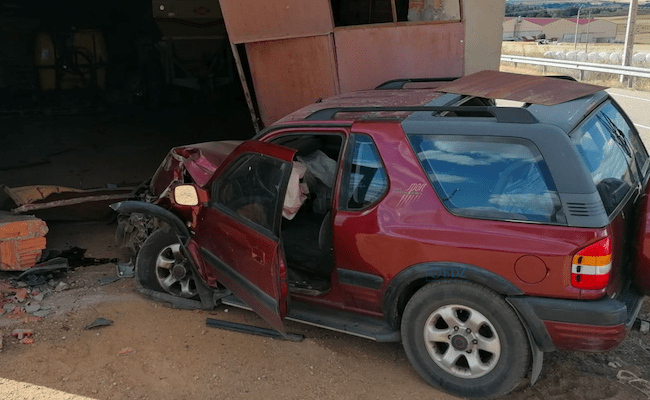 La entrada y parte de los muros de una pequeña nave agrícola de la localidad de Argujillo han quedado destrozados tras sufrir el gran impacto de un todoterreno Opel Frontera Sport, tal y como muestran las imágenes.