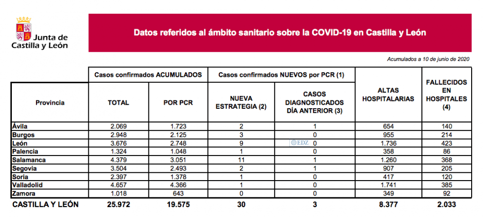 La Consejería de Sanidad, en el día 86 desde la declaración de estado de alarma, ha ofrecido los datos de la evolución del coronavirus en la comunidad, siguiendo una buena línea. En las últimas 24 horas, en Castilla y León, se han registrado 30 casos de la enfermedad COVID-19 (19 casos ayer), lo que sitúa su número actual en 25.972; de esa cifra, 19.575 han sido confirmados por PCR.