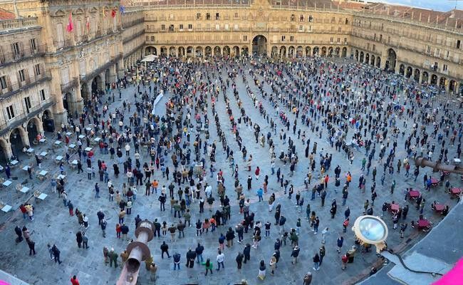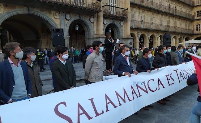 El mundo del toro salmantino se ha reunido esta tarde en la Plaza Mayor de la localidad para reivindicar la equiparación con el resto de trabajadores y artistas de la industria cultural en las ayudas y apoyo por el COVID-19, en una acción convocada por la Plataforma "Salamanca es Tauromaquia". Entre las personalidades que tomaron la palabra, estuvo el torero Enrique Ponce, que leyó un manifiesto en defensa de la tauromaquia. También acudieron el Juli, Perera, Manzanares, Udiales, Ureña, Castella, Uceda, Fortes Cristina Sánchez, López Chaves, Javier Castaño y Escribano.