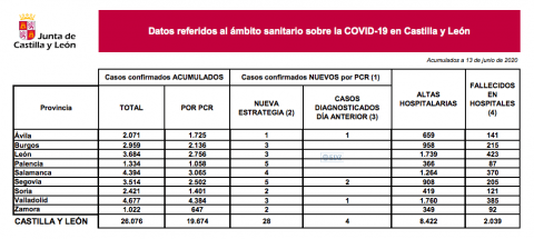La Consejería de Sanidad, en el día 90 desde la declaración de estado de alarma, ha ofrecido los datos de la evolución del coronavirus en la comunidad, siguiendo una buena línea. En las últimas 24 horas, en Castilla y León, se han registrado 18 casos de la enfermedad COVID-19 (28 casos ayer); aunque, de estos 18 casos, solo tres han sido diagnosticados en las últimas 24 horas, uno en Valladolid y Ávila y dos en Segovia. Estos positivos sitúan el número actual en 26.094 personas contagiadas; de esa cifra, 19.692 han sido confirmadas por PCR.
