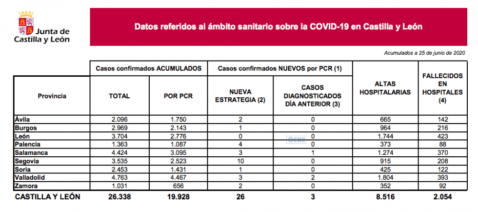 La Consejería de Sanidad, en el primer jueves de "nueva normalidad", ha ofrecido los datos de la evolución del coronavirus en la comunidad, con mejores datos que ayer, con 26 casos de la enfermedad detectados, aunque, de estos, solo 3 se consideran activos, al haberse diagnosticado en las últimas 24 horas, en Valladolid (2) y Salamanca. Estos últimos contagios sitúan la cifra total en 26.338 personas afectadas por coronavirus en nuestra comunidad y, de esa cifra, 19.928 han sido confirmados mediante PCR.