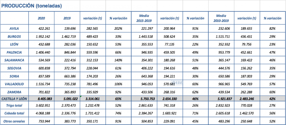 La producción de 2020 representa un incremento del 46 % respecto a la media de los últimos cinco años (5,75 millones de toneladas) y se sitúa 3,3 millones de toneladas por encima de la cosecha del año pasado (5,1 millones de toneladas), que en esa ocación estuvo muy afectada por la situación de sequía que se padeció fundamentalmente en el suroeste y centro de la Comunidad.