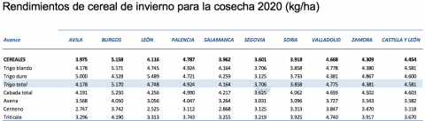 El rendimiento medio del cereal de invierno alcanza los 4.450 kilos por hectárea, un 58 % superior a la campaña pasada y un 44 % superior a la media de los últimos cinco años. Es el rendimiento medio mayor de los últimos 35 años. En la campaña de 2016, se presentaron los segundos mejores rendimientos, con una media de 4.170 kilos por hectárea.