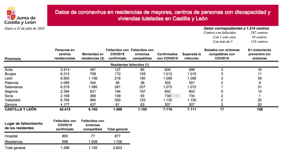 A estos fallecimientos, habría que sumar las personas que no han superado la enfermedad en centros sociosanitarios de la comunidad, con ningún fallecido en las últimas hoas y un total de 2.603 personas que han perdido la vida en residencias de Castilla y León. De estos fallecidos, 1.498 corresponden a casos confirmados por COVID-19 y otros 1.105 a fallecidos con síntomas compatibles con el virus. La situación en las residencias de la comunidad evidencia una mejoría, con menos personas aisladas y dos nuevas que han superado la infección.