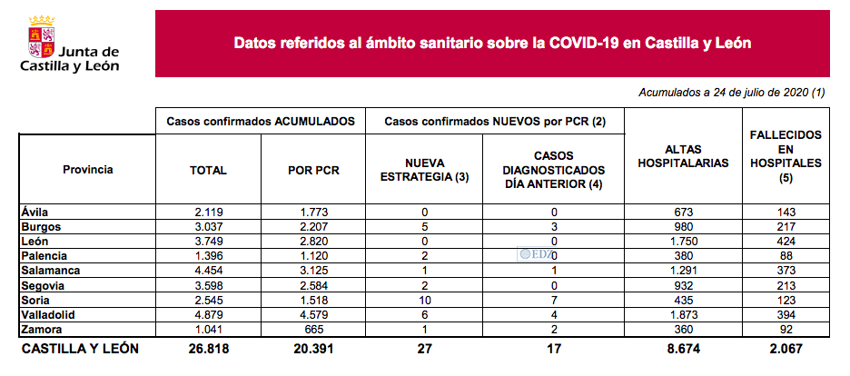 La Consejería de Sanidad ofreció ayer los nuevos datos de la evolución del coronavirus en la comunidad, notificando 27 PCR positivas por coronavirus, de los que 17 se consideran casos activos y nuevos, al haberse diagnosticado el día anterior, de los que dos son de Zamora y siete de Soria, donde más incidencia se está encontrando en estos últimos días.