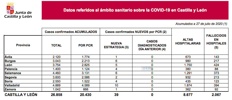 La Consejería de Sanidad ofreció hoy los nuevos datos de la evolución del coronavirus en la comunidad, notificando 39 PCR positivas por coronavirus, pero ninguno notificado en las últimas horas. Durante el fin de semana, en Zamora se habría confirmado un caso, con mayor incidencia en Valladolid, con 10 casos. El número actual acumulado es 26.858; de esa cifra, 20.430 tienen confirmación mediante PCR.