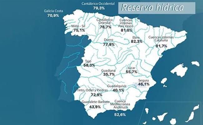 La reserva hídrica española está al 58,7 por ciento de su capacidad total. Los embalses almacenan actualmente 32.630 hectómetros cúbicos (hm³) de agua, disminuyendo en la última semana en 863 hectómetros cúbicos (el 1,6 por ciento de la capacidad total actual de los embalses).