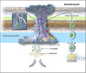 Un segundo artículo, visualiza la extraña infusión de 2/3 de agua y 1/3 de gas de amoníaco que se convierte en la semilla de las piedras de granizo jovianas, conocidas como nubes de hongo. Las nubes de hongo, que consisten en capas de granizo de agua-amoníaco y hielo cubiertas por una corteza de hielo de agua más gruesa, se generan de manera similar a la del granizo en la Tierra: creciendo a medida que se mueven hacia arriba y hacia abajo a través de la atmósfera.