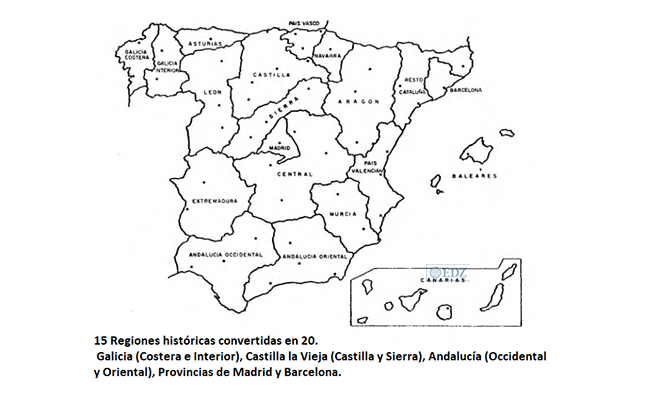 Ya en las primeras páginas del informe destacan la diversidad regional de España y reconocen que «las fronteras históricas llegan a separar situaciones muy reales con el paso del tiempo. Llegan a cambiar hasta el paisaje.» Para el análisis, se parte de las 15 regiones históricas desdoblando operativamente 3 de ellas por su heterogeneidad: Galicia (costera e interior), Castilla la Vieja (Castilla y Sierra, área Soria-Segovia-Avila, en la que destaca la atracción que recibe de Madrid) y Andalucía (occidental y oriental). A la vez, se individualizan las provincias de Madrid y Barcelona.