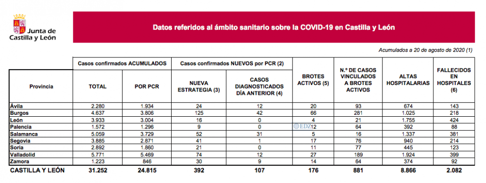 Por otra parte, Verónica Casado confirmó hoy 392 nuevos casos de contagios de coronavirus, con lo que su número actual acumulado es 31.252; de esa cifra, 24.815 son confirmaciones a través de pruebas PCR, de esos casi 400 positivos, 107 tienen diagnóstico durante las últimas 24 h. o síntomas, nueve en Zamora, donde sumamos ya 846 contagios confirmados con PCR desde marzo.