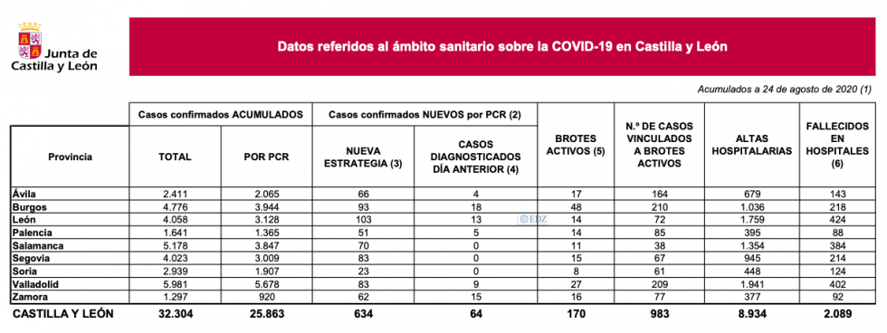 La consejera de Sanidad, en el día 65 de la llamada "nueva normalidad", ha confirmado una notable subida de casos de contagios: 634, con lo que su número actual acumulado es 32.304; de esa cifra, 25.863 son confirmaciones a través de pruebas PCR, de esos positivos confirmados, 64 tienen diagnóstico o síntomas el día antes de los días 21, 22 y 23 de agosto16 en Zamora, donde sumamos 920 contagios confirmados con PCR desde marzo.