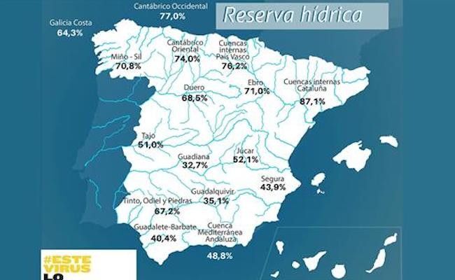 La reserva hídrica española está al 52,3 por ciento de su capacidad total. Los embalses almacenan actualmente 29.111 hectómetros cúbicos (hm³) de agua, disminuyendo en la última semana en 891 hectómetros cúbicos (el 1,6 por ciento de la capacidad total actual de los embalses).