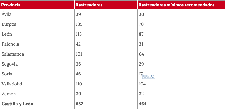 Según los datos ofrecidos por Sanidad, Zamora es la única provincia de Castilla y León que cuenta con menos rastreadores de los propuestos por el Ministerio como necesarios, cifrado en la proporción 1/5.000 habitantes. En nuestra provincia tenemos 30 rastreadores, de los 32 mínimos necesarios.