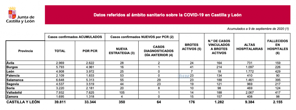 La Consejería de Sanidad, en este día 201 desde que se declaró el estado de alarma y 81 de la llamada "nueva normalidad", ha ofrecido nuevos datos sobre la evolución de la pandemia, tras la confirmación de otros siete días de medidas de contención en las ciudades de Salamanca y Valladolid.