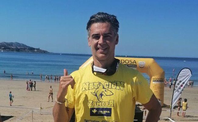 El nadador de 51 años se lanzó al agua con otros 190 nadadores para afrontar,por primera vez, los 4 km en las frías aguas gallegas.La temperatura del agua estaba entorno a los 18 grados.