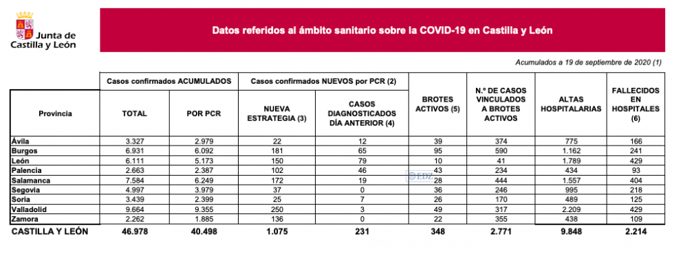 Siguen siendo muy superiores los casos comunicados de días anteriores, así, de los 1.075 nuevos casos notificados hoy al C.C.A.E.S., son 231 los que tienen diagnóstico del día anterior, ninguno en la provincia de Zamora, donde se contabilizan 1.749 positivos con PCR desde marzo, al sumarse también 136 positivos de días anteriores, elevando la preocupación, con una tendencia epidemiológica en alza, arrastrada por los nuevos brotes en las residencias, centros escolares y empresas.