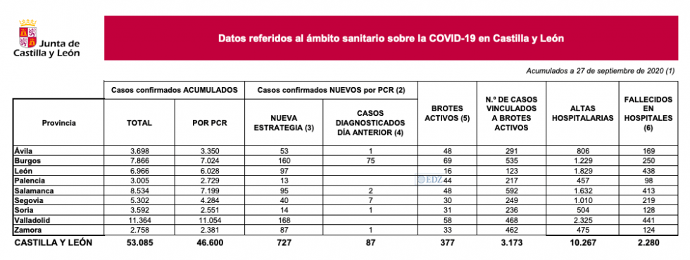 En el día 221 desde que la OMS declaró el estado de pandemia a nivel mundial, la Consejería de Sanidad de la Junta de Castilla y Léon informa de los nuevos datos de la evolución de la crisis sanitaria en nuestra comunidad, con la notificación de 727 PCR positivas por SARS-CoV-2, con una mejoría con respecto ayer, día en el que se comunicaron 913 contagios, con lo que su número actual acumulado es 53.085; de esa cifra, 46.600 tienen confirmación a través de analítica PCR.