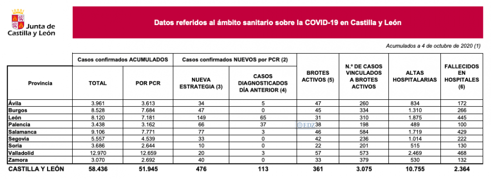58.436 casos de la COVID-19 en Castilla y León; 51.945 de ellos, positivos por PCR