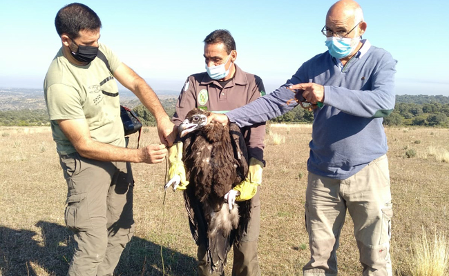 Agentes Medioambientales de la Junta de Castilla y León en la provincia de Zamora han procedido en el día de hoy a la suelta de un buitre negro en el parque natural de Arribes del Duero. Se trata de un ejemplar juvenil que fue recogido el pasado 16 de junio procedente de la comarca de Tábara con problemas de nutrición y daños en plumaje y desde entonces fue tratado en el Centro de Recepción de Animales Silvestres (CRAS) de Villaralbo. Antes de la suelta se ha llevado a cabo su radio marcaje con un emisor para poder hacer un seguimiento de sus movimientos. Junto al buitre negro también se han soltado en el mismo lugar 6 lechuzas y un milano.