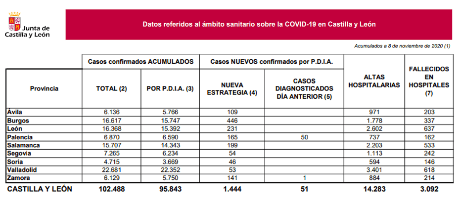 La Consejería de Sanidad de Castilla y León ha notificado hoy 1.444 nuevos casos de contagio por SARS-CoV-2, con lo que su número acumulado de casos desde marzo alcanza los 102.488, tras superar ayer la cifra terrible y redonda de 100.000 personas; de esa cifra, 95.843 han sido diagnosticados por medio de pruebas de infección activa.
