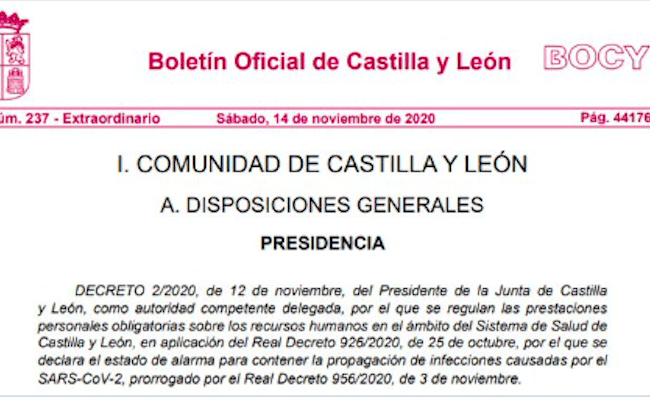 Mediante una nota de prensa, los seis sindicatos de la Mesa Sectorial de Sanidad, muestran su rechazo al decreto que regula "las prestaciones personales obligatorias", por el tiempo "indispensable", sobre los recursos humanos del sistema sanitario que hoy, sábado, recoge el Boletín Oficial de Castilla y León (Bocyl) "con el objetivo de reforzar el servicio de salud y hacer frente a la pandemia de la COVID-19".