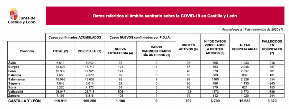 Según estos nuevos datos de hoy, las provincias con más casos son Valladolid, con 505 positivos nuevos; 171, nuevos en León y 121, en Burgos. La siguente provincia en nuevos casos es Zamora, que hoy sube la incidencia, con 108 positivos, tras los 88 de ayer.