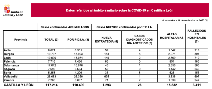 La Consejería de Sanidad de Castilla y León ha informado hoy de los nuevos datos de la pandemia en la comunidad, con una subida de los casos con respecto a los facilitados ayer, superando los 1.000 nuevos positivos, pero muy lejos de los más de 2.000 diarios de la semana pasada. Así, se han notificado 1.293 contagios por SARS-CoV-2 (ayer fueron 1.186), ya lejos del conocido efecto fin de semana. Así, la cifra de contagios diagnosticados con pruebas de infección activa son ya 110.499, que son 117.214 si sumamos los casos con sospecha clínica.