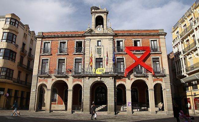 La fachada del edificio municipal luce un gran lazo rojo contra el sida y una pancarta contra la pena de muerte