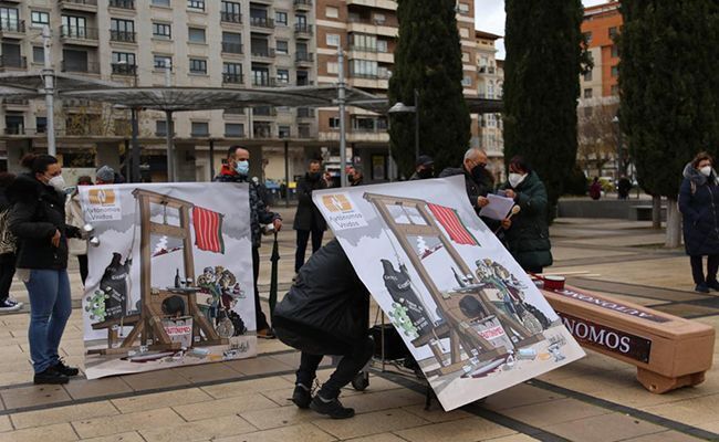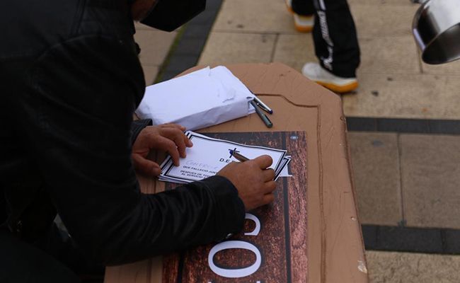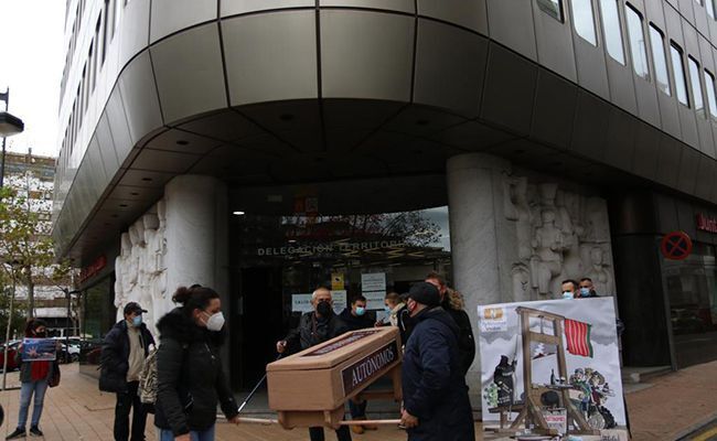 Autónomos Zamora han vuelto a manifestarse por el centro de la ciudad, desde la plaza de La Marina a la Delegación de la Junta de Castilla y León, donde introdujeron un féretro, verdadero cenotafio; firmaron esquelas de defunción de los autónomos zamoranos, convertidos, por mor de la pandemia vírica y las decisiones políticas en proletarios, ante la descomposición y cierres de numerosas empresas, y una pintura, protagonizada por una guillotina, con la seña bermeja incluida, que cercena la testa de los autónomos de nuestra ciudad y provincia. Hubo imaginación en la concentración de esta mañana. La ideas van fluyendo en el cerebro de los autónomos zamoranos.