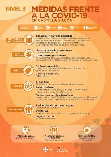 De forma más concreta y sectorializada, las medidas se pueden consultar en el acuerdo 76/2020, de 3 de noviembre, de la Junta, por el que se establecen niveles de alerta sanitaria y se aprueba el Plan de medidas de prevención y control para hacer frente a la crisis sanitaria ocasionada por la COVID-19 en la Comunidad de Castilla y León ( ACUERDO 76/2020, de 3 de noviembre, de la Junta de Castilla y León ).