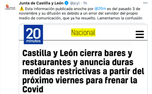 El periódico "20 minutos" republicó ayer, por error, una información de noviembre, anunciando el cierre de la hostelería y medidas restrictivas a partir del próximo viernes en toda Castilla y León y esa noticia se hizo viral poco después, compartiéndose en redes sociales, aunque, con solo abrirla, se veía la sospechosa fecha de noviembre.
