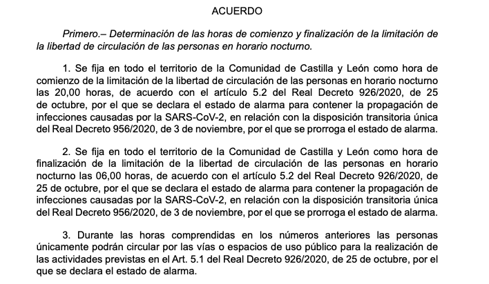 La decisión de adelantar la hora del toque de queda a las 20.00 horas está amparada, según defiende la Junta de Castilla y León, en que "en el momento en que se autoriza la prórroga del estado de alarma, se acuerda la modificación, por un lado, de los artículos 9 y 10 del Real Decreto, incluyendo en la regulación de la eficacia de las limitaciones, su modulación, flexibilización y suspensión, la prevista en el artículo 5", y por otro lado, se indica expresamente en su Disposición transitoria única en relación a la “eficacia de la limitación de la libertad de circulación de las personas en horario nocturno” lo siguiente: